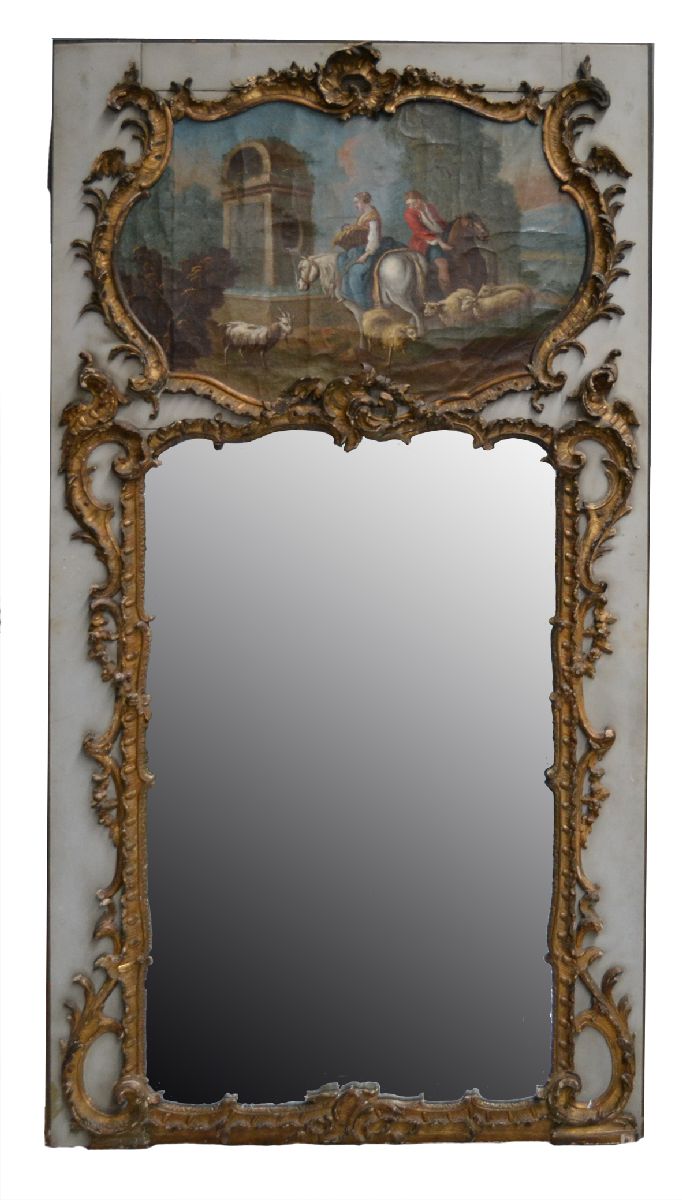 fitted with a oil on canvas, couple on horse back near a fountain with sheep, 208 x 112 cm -
