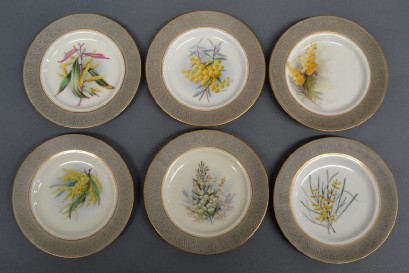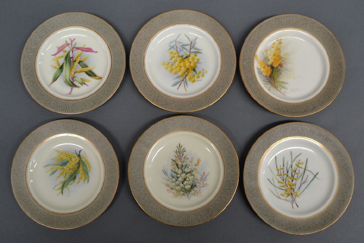 Worcester plates, painted with Australian wild flowers, painted by R Austin & B.M.Bradshaw, retailers Flavelle Brothers Ltd, various titles, "Acacia Decora" A Cunninghamii, "Glaucescens" Acacia Linifolia, Acacia Doratoscylon, etc ( -