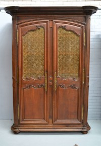 century French oak two door armoire, fitted with old French patterned glass to the upper door panels, breakfront pediment & base, Standing 280 cm H x W 200 cm D 70 cm -