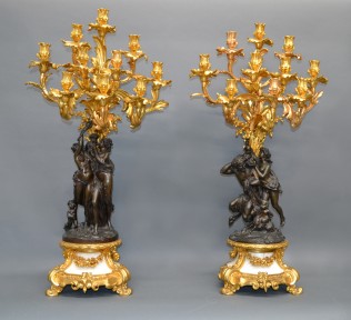 19th century ten light candelabra in bronze, ormolu and marble, one featuring Pan with bacchante and children, the other featuring bacchante with musician and children in ormolu and mounted on a circular foot, both on a waisted shaped -