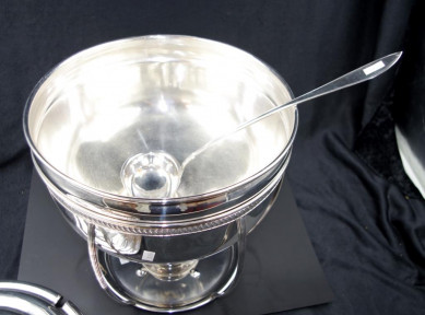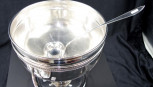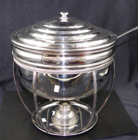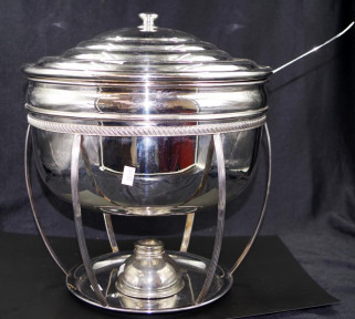 comprising a lidded soup tureen on a stand with burner and a soup ladle -