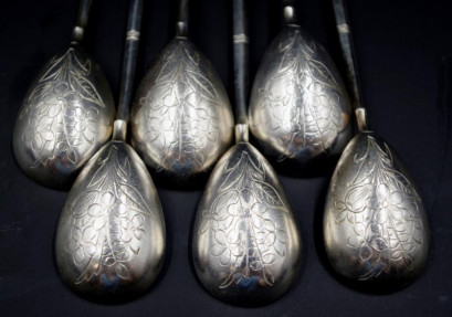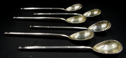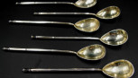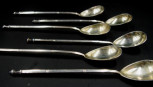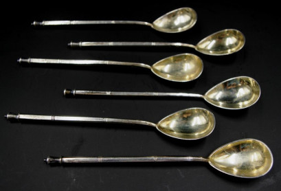 hallmarked 84, each with decorative finial and stem, gilt washed bowls, engraved verso (length 15cm approx, each; weight 144grams approx, total). -