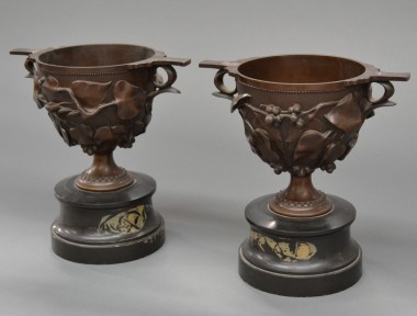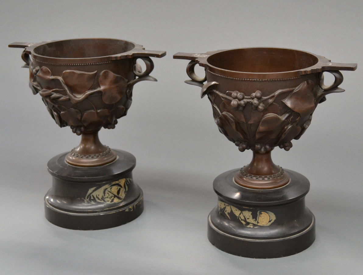 century bronze urns, cast in high relief with trailing leaves and berries, mounted on turned marble bases, 25 cm high each (2) -