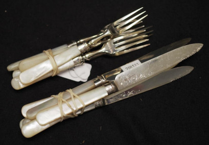 Lot Description:Set of 6 sterling silver & MOP fruit knives &forks
