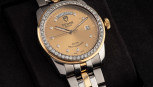 Automatic, circular gold dial with diamond numerals, day at 12, date at three, diamond set bezel, stainless steel case, gold and stainless steel bands, 31mm diameter, boxed. -