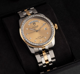 Lot Description:A Gents Tudor Day Date Gold, Stainless Steel and Diamond Wristwatch
