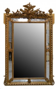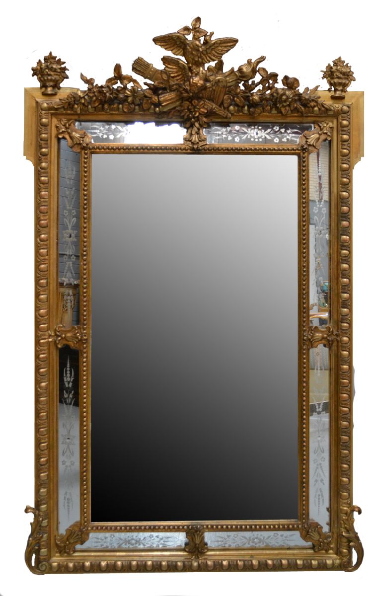 cushion mirror, the side panels with reverse cut decoration. The crest cast with birds, Torches & quiver of arrows. H 183 cm x W 110 cm -