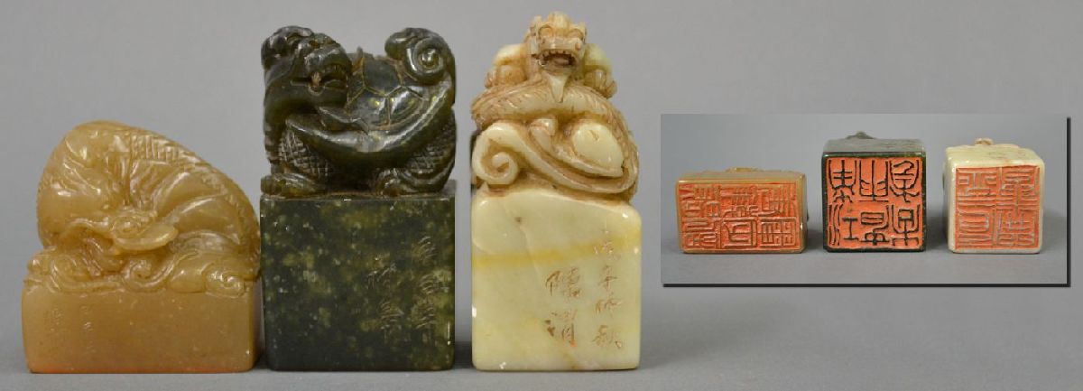 seals Late 19th/20th century, carved from spinach hardstone, a creamy nephrite stone, and a soapstone, all carved with mythical beasts, on the tops and incised date & artist signature to the sides, 9.2 cm 9.2 cm & 6.8cm respective -