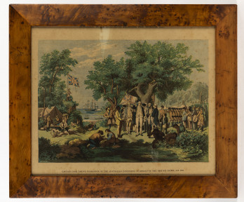 Lot Description:An antique Tasmanian huon pine picture frame, with an 1865 colour lithograph of Captain Cook, mid 19th century