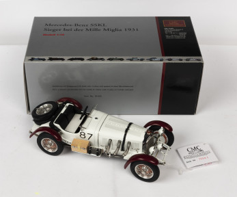 Lot Description:MERCEDES-BENZ: A NOS 1:18 scale CMC M-055 Mercedes-Benz SSKL 1931 Mille Miglia #87 die-cast model with information booklet