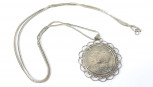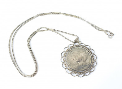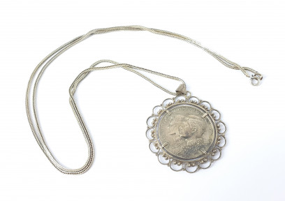 with coin set pendant. Total weight 24g. Length chain 74cm. -