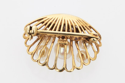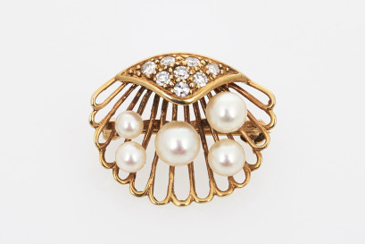 14ct yellow gold designed with 5 cultured white pearls, 8 round brilliant cut diamonds, stamped '585 JK'
