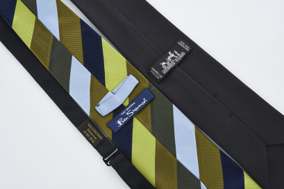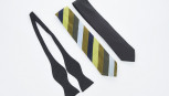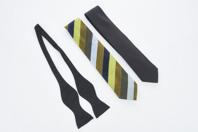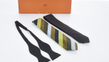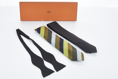 noir silk, labelled 'Hermes Paris Made in France 100% silk', together with striped green silk tie, labelled 'Ben Sherman', together with black silk bow-tie labelled 'Wellington' (3) -