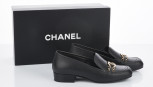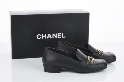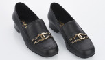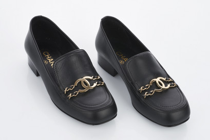 black calfskin leather featuring gold tone chain and logo hardware, rounded toe, stamped 'Chanel Made in Italy', very good condition, minor wear to sole