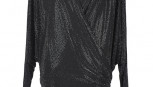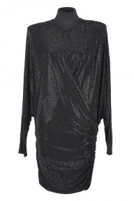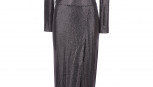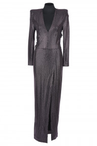 black sequinned jersey featuring a side drape, long sleeves, shoulder pads, V neckline, together with purple sequinned jersey, long sleeves, shoulder pads, V neckline, floor length with slit, velvet belt, labelled 'Alexandre Vathier Made in Italy' (2)