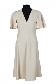 cream with bell shaped short sleeves, v neckline, fitted waist, zip closure to back, silk lining, labelled 'Valentino Made in Italy'
