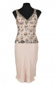 soft pink slip with silver emroidered lace overlay, silk lining, labelled 'Collette Dinnigan Made in Australia', together with beige silk and silver sequins, labelled 'Collette Dinnigan Made In China' (2)