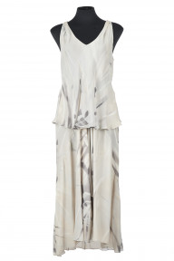 beige grey with watercolour pattern, lightweight sleeveless top with V neckline, together with matching ruffle skirt, labelled 'Giorgio Armani Made in Italy 100% silk' (2)