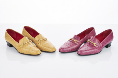 crocodile pink leather with narrow rounded toe, gold tone horsebit buckle, red internal lining, together with matching yellow leather pair, both labelled 'Celine Paris Made in Italy' (2) (A/F) signs of wear consistent with use