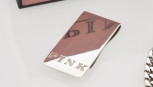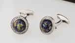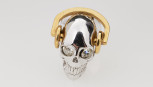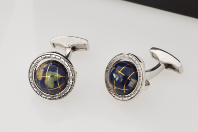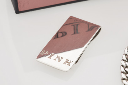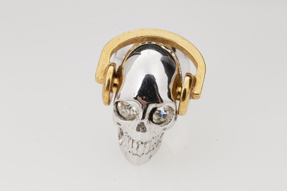 silver skull with headphones and crystal eyes, together with sterling silver cufflinks designed with spinning enamel globe, together with 'Pink' Money clip, stamped '925' (3) -