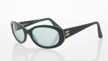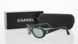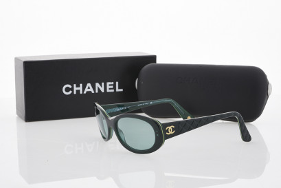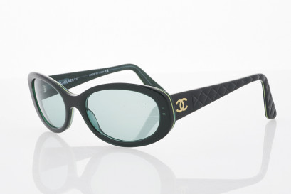 dark green accetate featuring pale green stripe on outer edge, quilted pattern on arms, stamped 'Chanel Made in Italy' -