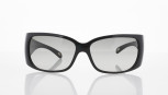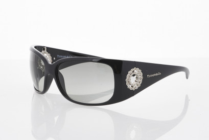 black opaque accetate, crystal logo design at each hinge, labelled 'Tiffany & Co.' -