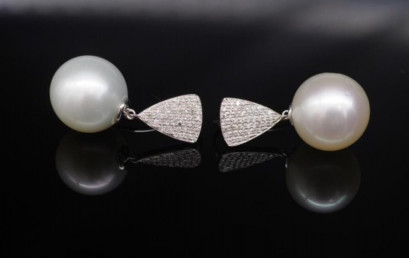 Lot Description:South Sea pearl, diamond and 14ct white gold drop earrings