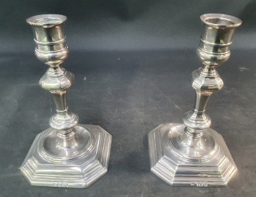 in the Queen Anne style with faceted knopped stem, and on stepped square base, Thomas Bradbury & Son, London 1894, height: 17 cm. Weight: 492 gm. -