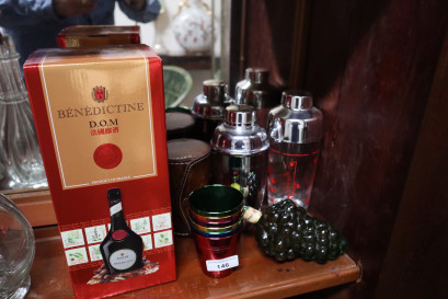 one with measurements, Gori Chanti grape shaped bottle, Benedictine D.O.M in box, aluminium-coloured tankards in leather case etc -