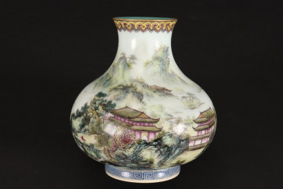 painted with a continuous landscape depicting a house amongst trees and mountains, on circular foot, four character mark to base, height 13cm -