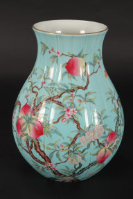 of lobed baluster form, beautifully decorated with branches of peaches, blossom and bats, in rich tones of pink, green, blue and orange on a turquoise ground, seal mark to base, height 30.5cm -