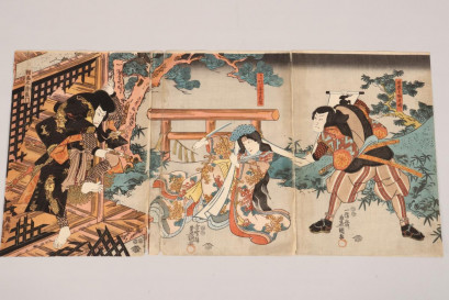 Lot Description:Original Japanese Woodblock Triptych Toyokuni III (aka Kunisada, 1786-1864) - depicting three Kabuki actors in an indoor/outdoor scene