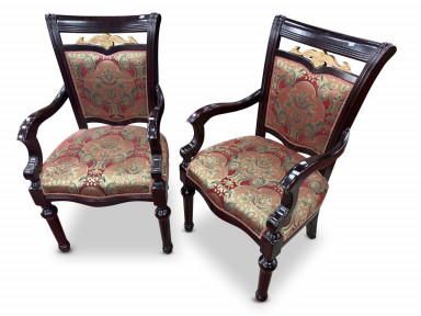 with a rectangular back, with carved and pierced crest rail, above scrolled arms, above a brocade seat and back, above turned legs, in a black and ebonised finish (2) -