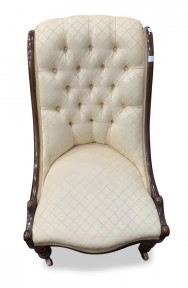 with curved buttoned back and sloping sides, with over covered seat on turned legs -