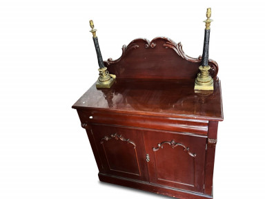 with a carved crest rail, above a rectangular top, set with a long drawer above a pair of carved doors, on pedestal base, 94cm x 106cm x 52cm -