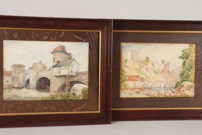 portraying European landscape scenes with bridges, 24cm x 33cm and 23cm x 34cm, set within oak frames and mount boards, works possibly by Edward Baker Boulton (Britain, Australia, 1812-95) however more research needed (2) -