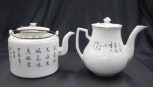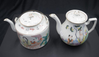 both with figural and character wring decoration, rain marks to bases (chips to one teapot lid) -