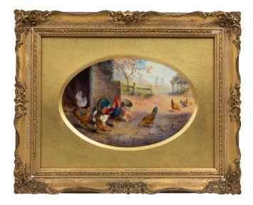depicting a farmyard scene with chickens and cockerel, faintly signed C. Johnson lower right, puce backstamp verso