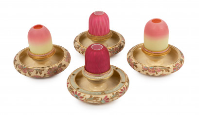 Lot Description:Four fairy lamps on floral decorated ceramic bases, late 19th century