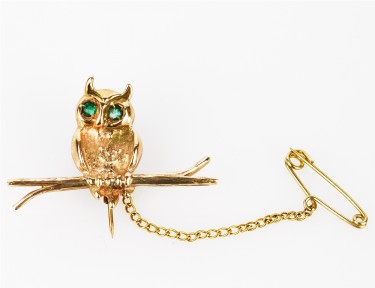 18ct yellow gold owl on a branch with emerald eyes, safety chain
