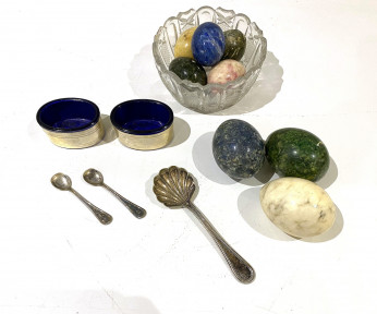 together with A Pair of Italian Silver (800) Condiment Spoons, A Moulded Glass Bow, EPNS Spoon and Decorative Egg Ornaments, various -