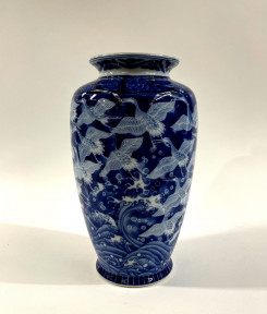 Lot Description:A Vintage Japanese Blue & White Stem Vase Depicting Crane & Wave Motifs