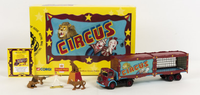 Lot Description:ERF: A NOS 1:50 scale Corgi ERF KV & Circus Trailer die-cast model