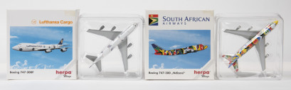 Lot Description:HERPA WINGS: 2 NOS 1:500 scale Herpa Wings Aircraft: Boeing 747 Lufthansa Cargo & South African "Ndizani" die-cast models