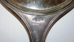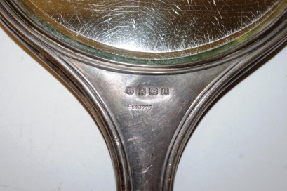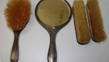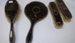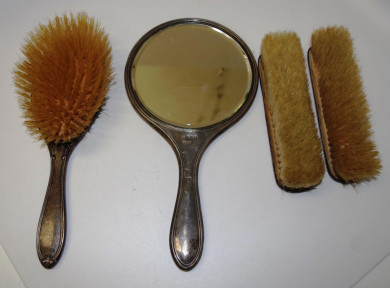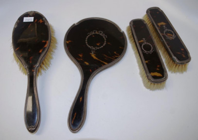 4 piece set, including hand mirror, hair brush, and pair clothes brushes, each with silver frame, hallmarked for Birmingham 1919, with inset tortoiseshell decoration. -