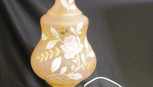 with crackle glaze and handpainted leaves and brass fittings, height approx 50cm, together with pink lamp shade -