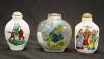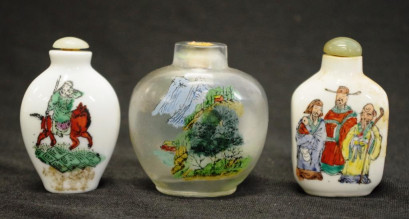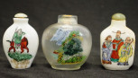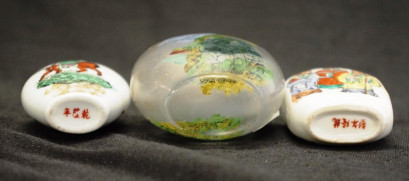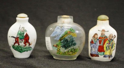 each with painted figural decoration, and greenstone stopper, character marks to bases, (height 7cm approx, each); together with a Chinese crystal inside painted snuff bottle, (stopper unavailable), (height 7cm approx). -