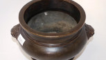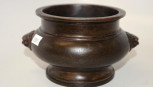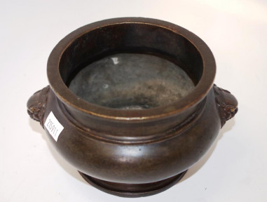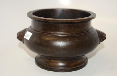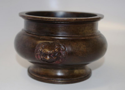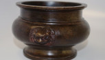 decorated with dual mask head handles, footed base, character mark to base, (height 8.5cm; diameter 15cm approx). -