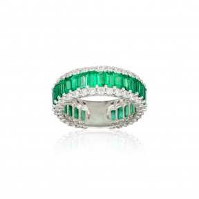 Claw-set to the top with a near continuous line of 29 emerald-cut emeralds bordered by similarly set brilliant-cut diamonds, the emeralds and diamonds together weighing approximately 2.93 and 1.56 carats respectively, size N½. -
