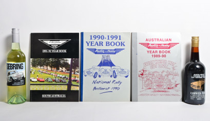 including three consecutive 'AUSTRALIAN Austin-Healey YEAR BOOK' from 1989-90 to 1991-92, together with 'AUSTIN HEALEY OWNERS CLUB 10th NATIONAL RALLY - COBWEB PORT', made by Rovalley Wines (SERIES 4), and 'SEBRING, 2015 ADELAIDE HILLS SAUVIGNON BLANC. -